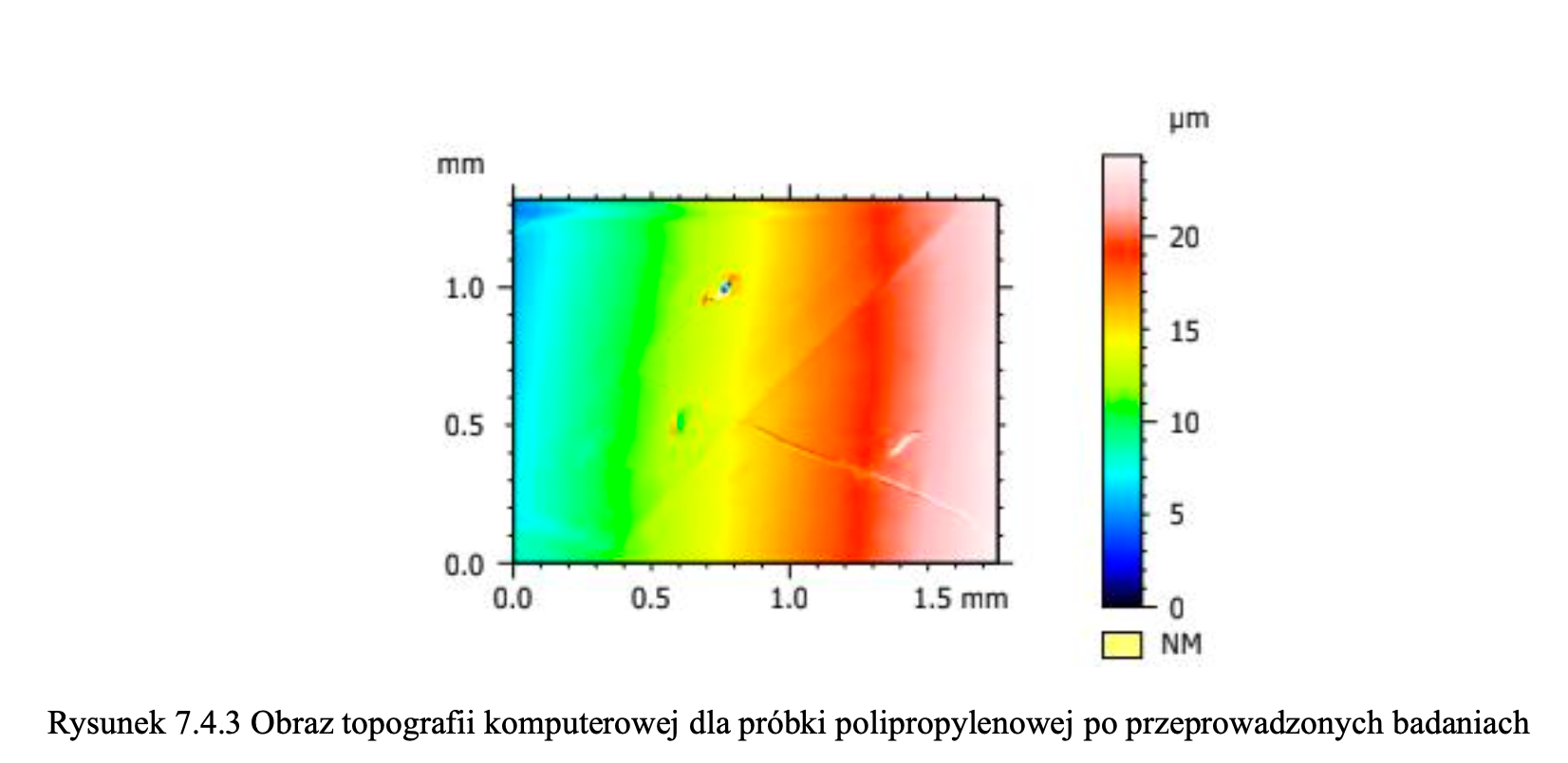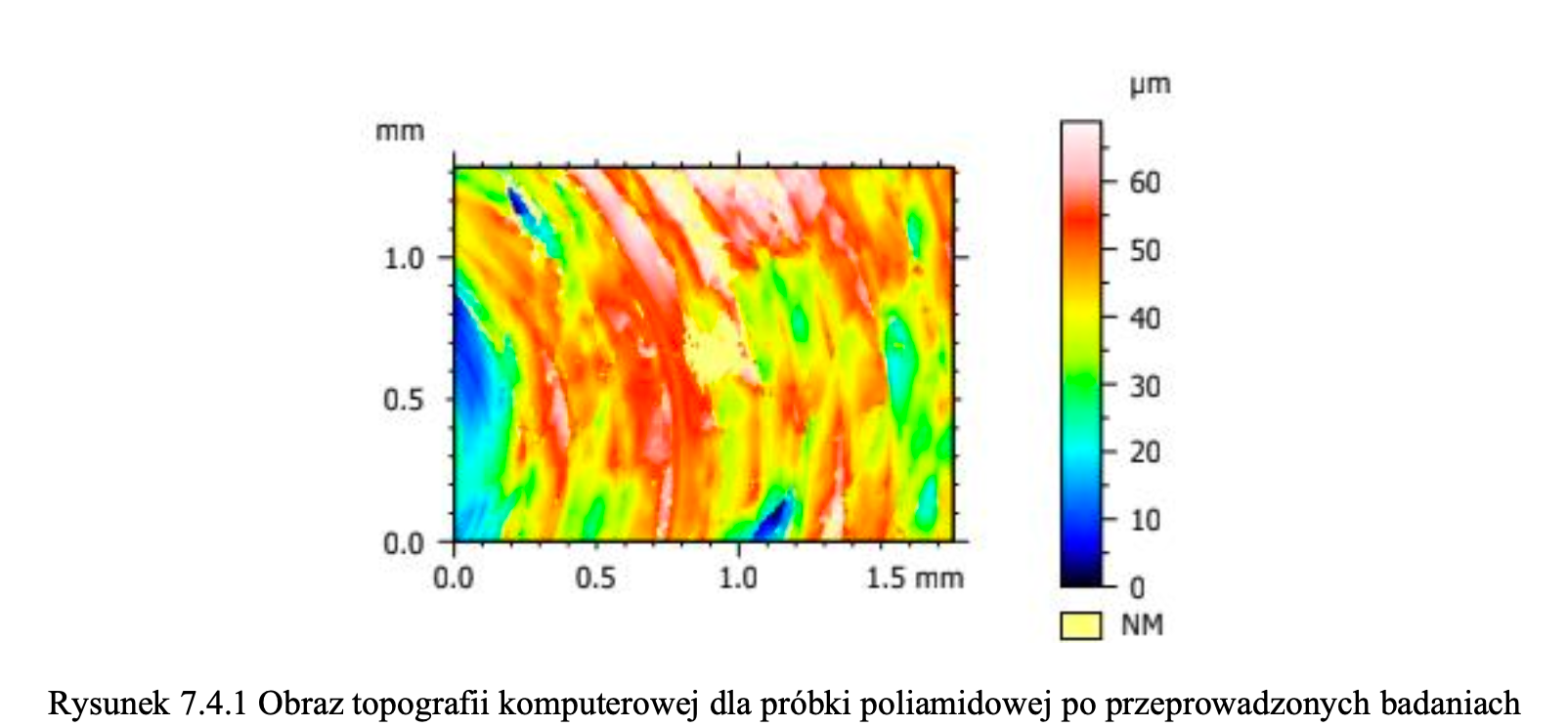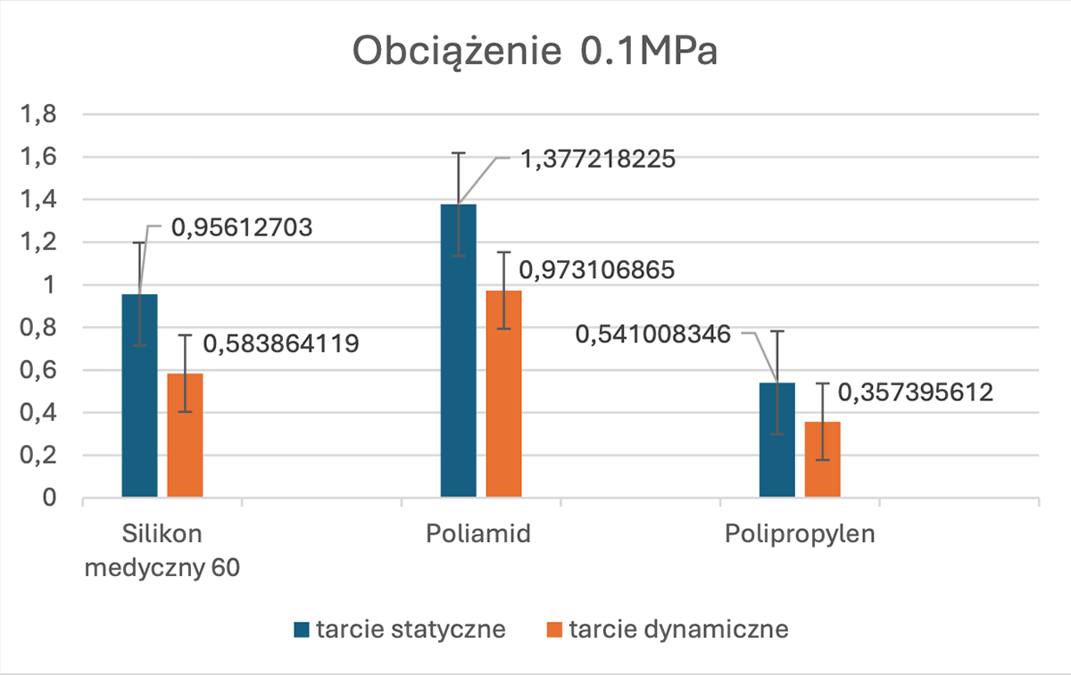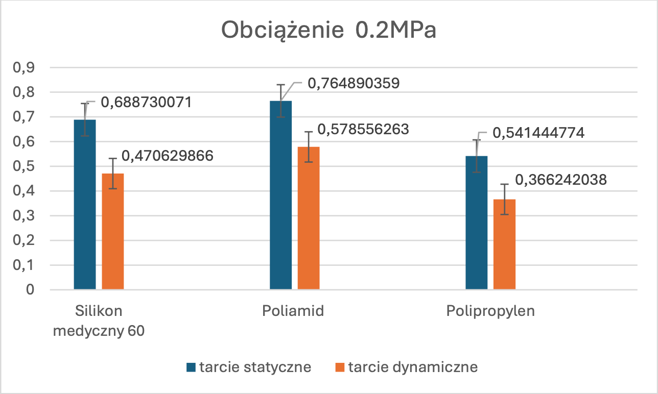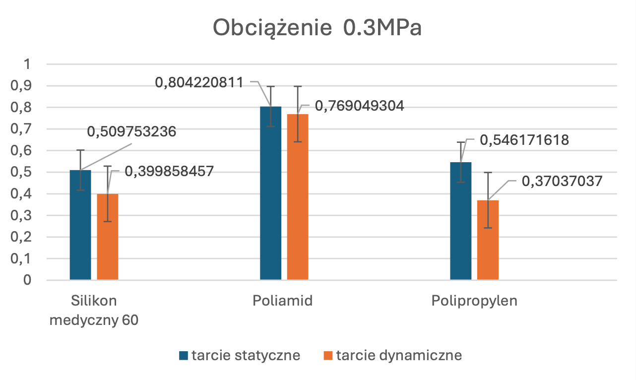 Analiza chropowatości powierzchni rzuciła nowe światło na zachowanie badanych materiałów, ujawniając istotne różnice w ich strukturze po zużyciu. Największą zmianę odnotowałem w przypadku Poliamidu, który charakteryzował się najwyższą chropowatością (profil od 0 do 60 μm). Wynikało to z silnej interakcji mechanicznej i ścierania, co paradoksalnie stało się jego atutem. Z kolei Silikon medyczny wykazał umiarkowaną chropowatość (0–25 μm), co świadczy o jego zdolności do adaptacji w kontakcie z dłonią, natomiast Polipropylen pozostał najgładszy (0–20 μm), wykazując najniższą podatność na zużycie, ale i najsłabszą interakcję ze skórą.